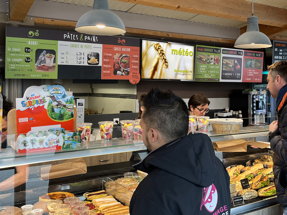 vous trouverez un large choix de pain, un espace snacking où vous pourrez vous restaurer le midi avec une offre variée de pâtes, salades, quiches, sandwichs et pizzas.